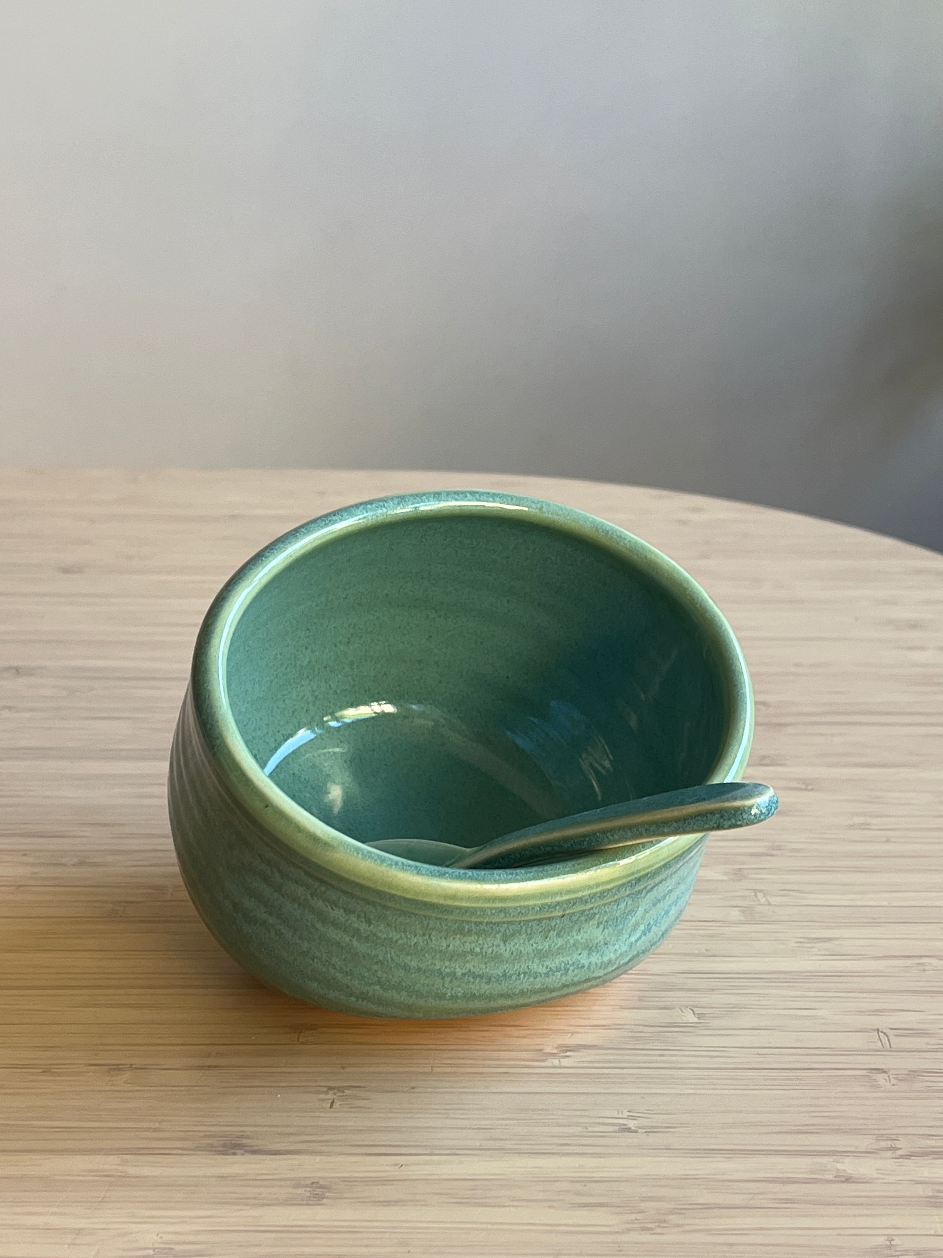Elevate your culinary experience with this handmade ceramic salt cellar. Expertly crafted with a refined finish, it includes a delicate spoon for effortless seasoning. Its elegant design not only enhances your kitchen decor but also offers convenient access to your favourite salts, blending functionality with timeless sophistication.