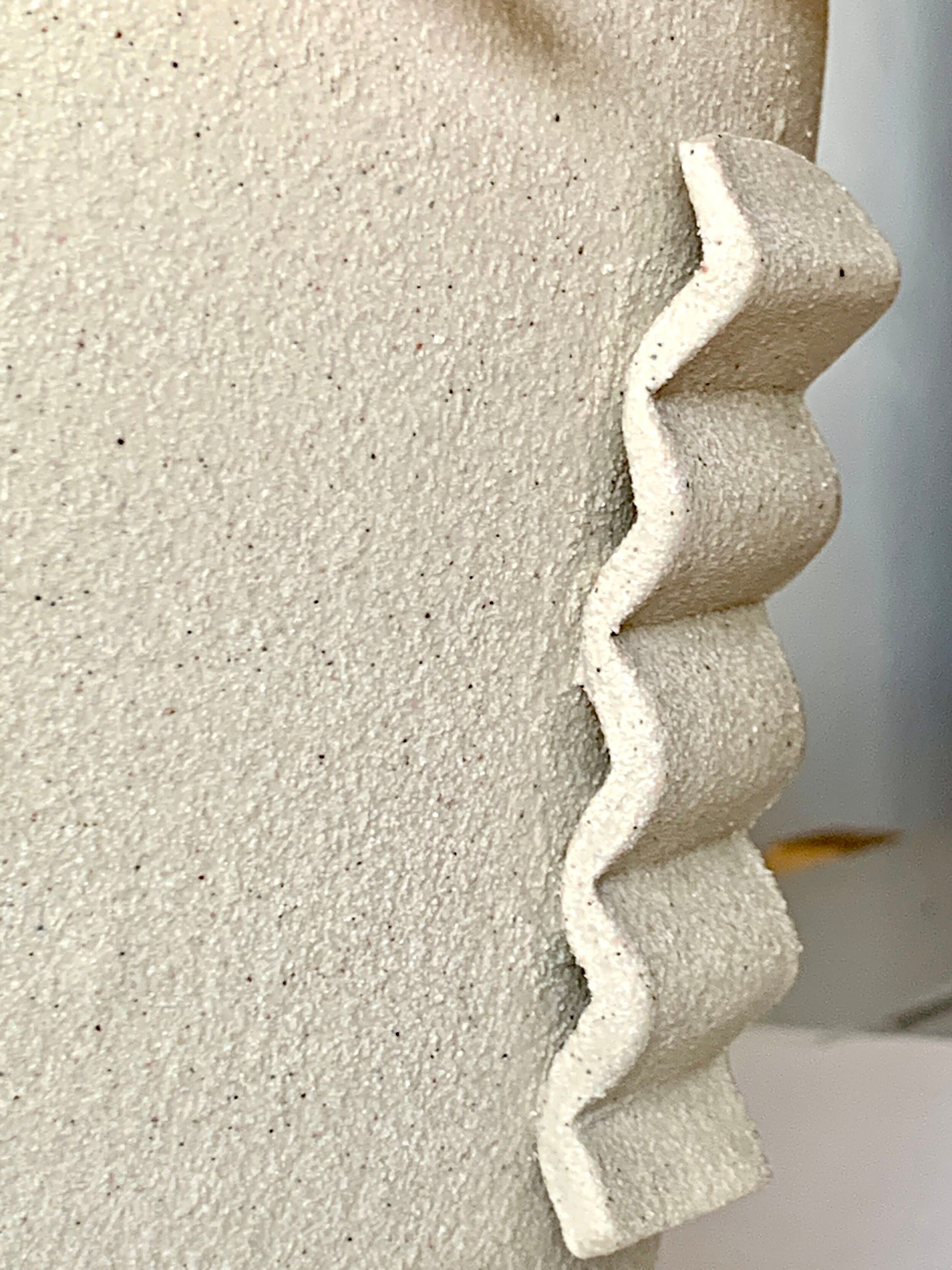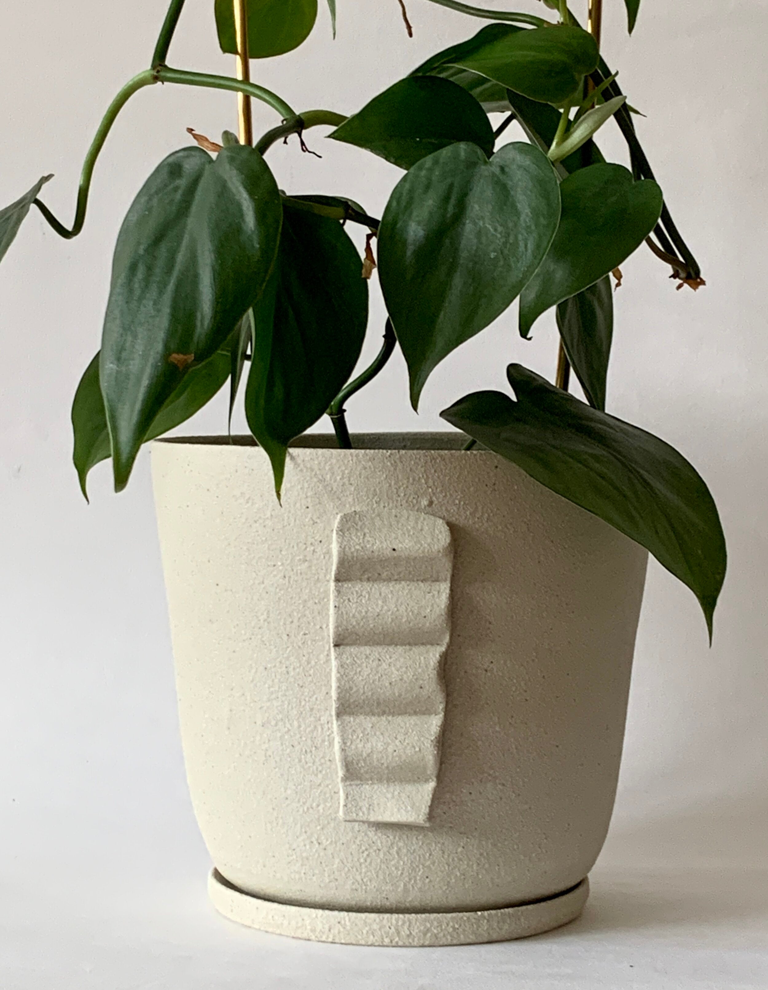 Wheel thrown planter in textured, stoneware clay with zig zag medallion. The neutral tones on this lovely clay body are great for showing off the beautiful green foliage of your indoor or outdoor plants. All have drainage hole and saucer.